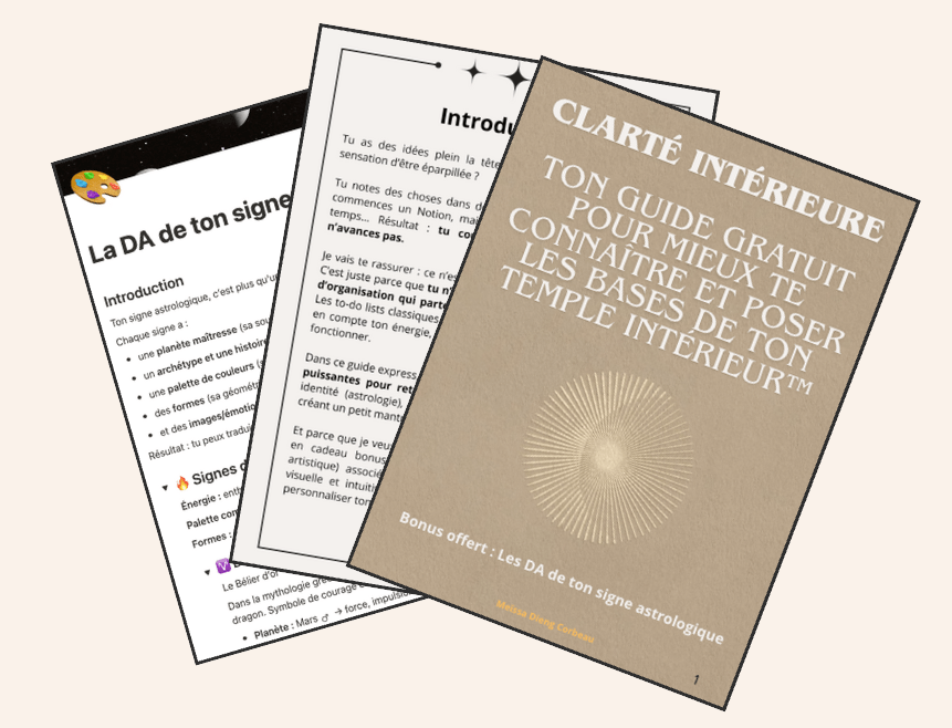 C’est exactement ce que je t’offre dans mon guide gratuit “3 étapes pour arrêter de t’éparpiller et retrouver ta clarté avec Notion”. Télécharge-le ici et commence à poser les bases de ton propre Temple Intérieur™.